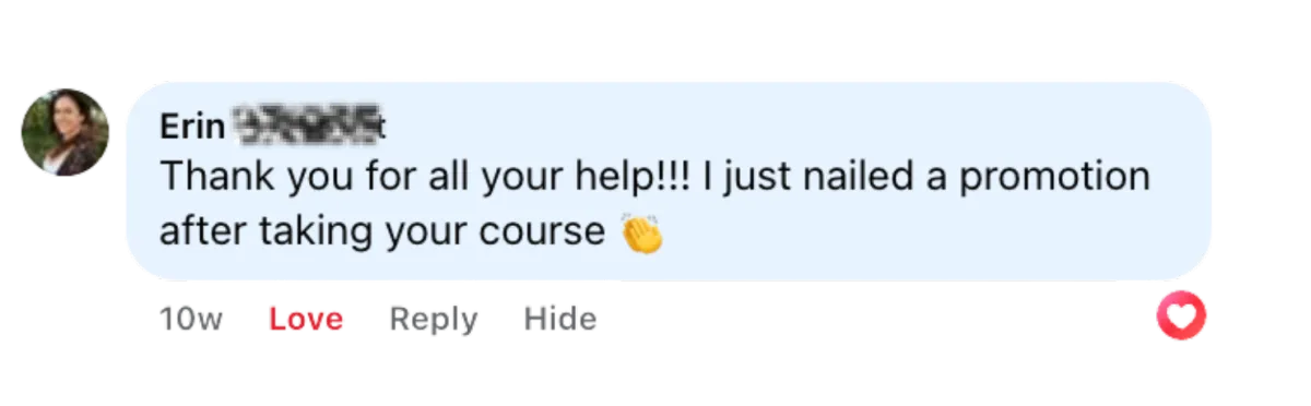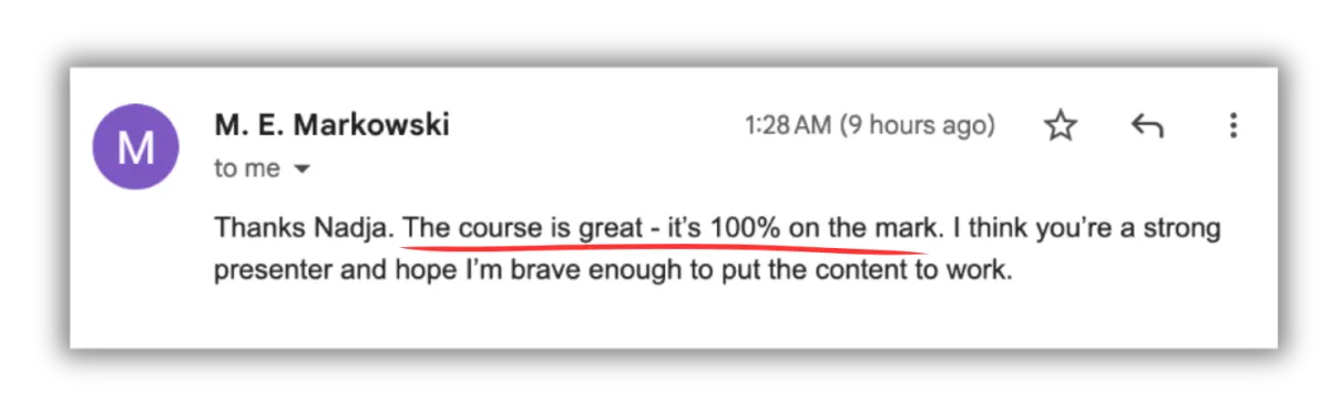 – Karen, Course Member“Nadja doesn’t just motivate you—she gets you into action. I came in feeling stuck and left knowing exactly what to do and why it mattered. And the stuff she teaches works — I finally got my senior title and an $8K raise!”